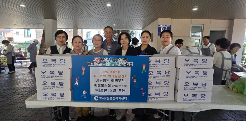 2025년 9월 효자2동 주민화합 한마당 큰잔치 떡 후원 페이지 정보 작성자예맥무천예술보존회 댓글 0건 조회 19회 작성일 25-10-06 15:27 본문 2025년 효자2동 주민화합 한마당 큰잔치 떡 후원 페이스북 공유 트위터 공유 SNS 공유 목록 다음글2025년 을사년 춘천 효자동 홀로 계신 어르신들에게 설에 드실 떡국떡을 전달했습니다. 25.01.29 댓글목록